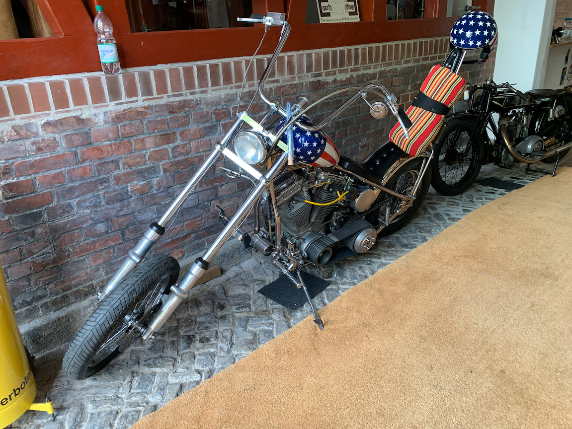 En af syv kopier af Peter Fondas Harley fra filmen Easy Rider. Da den er lavet til Europa har den forbremser.